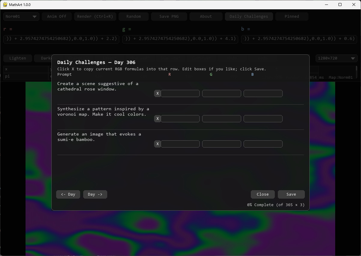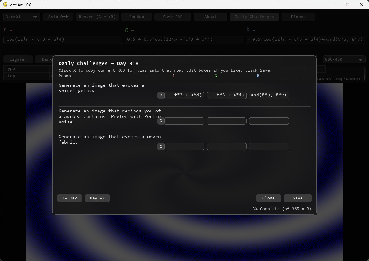 Part of the MathArt experience is learning how to use it. Plug in values, variables, and functions and see how they change the image. As you gain experience, complete over a thousand daily challenges to test your skills and learn more about mathematical art.