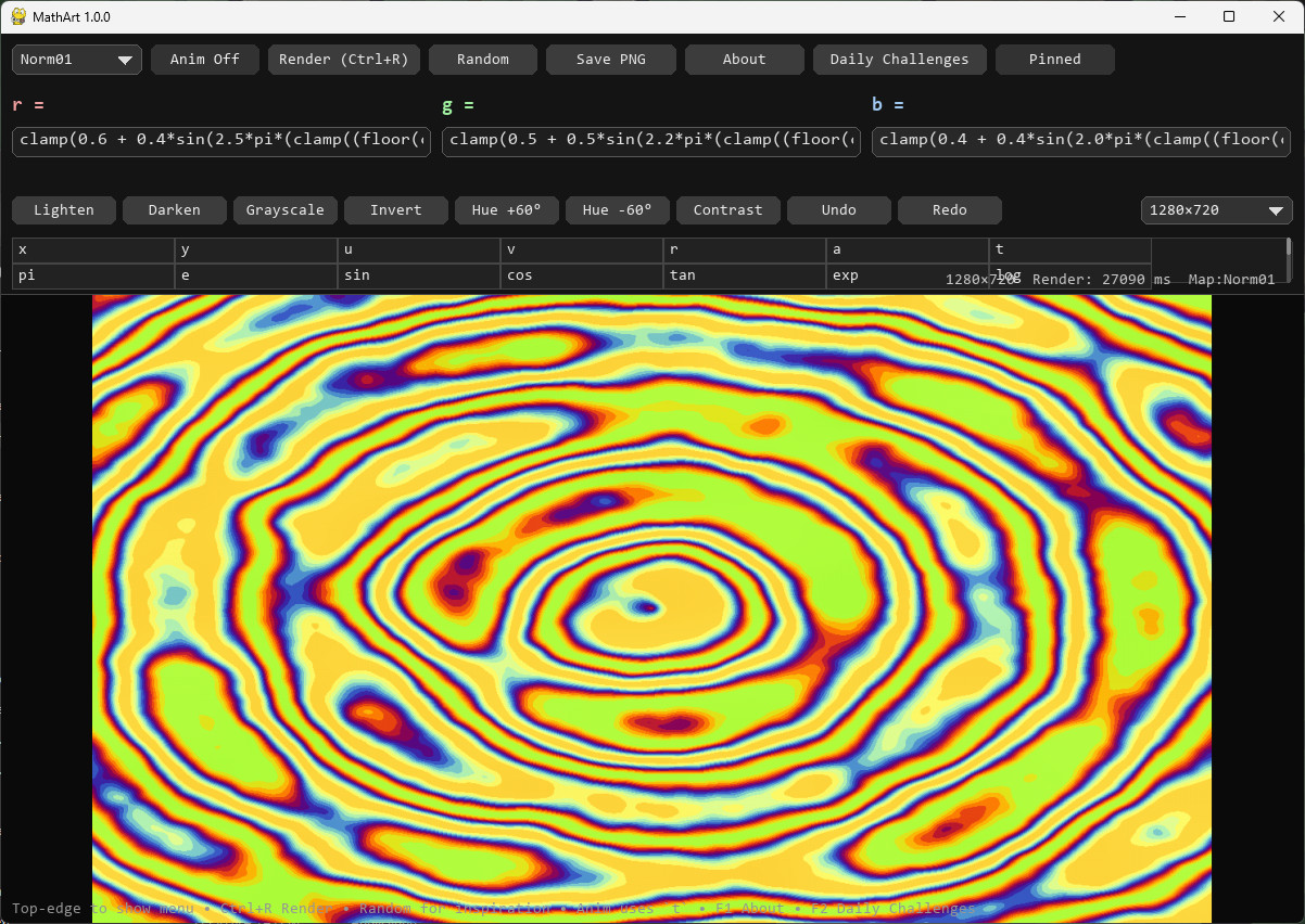 Turn formulas into flowing, living digital art. MathArt is an interactive sandbox where you craft visuals using the language of math. No two creations are alike. Every formula becomes a world, a pattern, a motion, a pulse of color. Whether you are an artist, a math enjoyer, or just curious, MathArt invites you to experiment, explore, and create something beautiful.